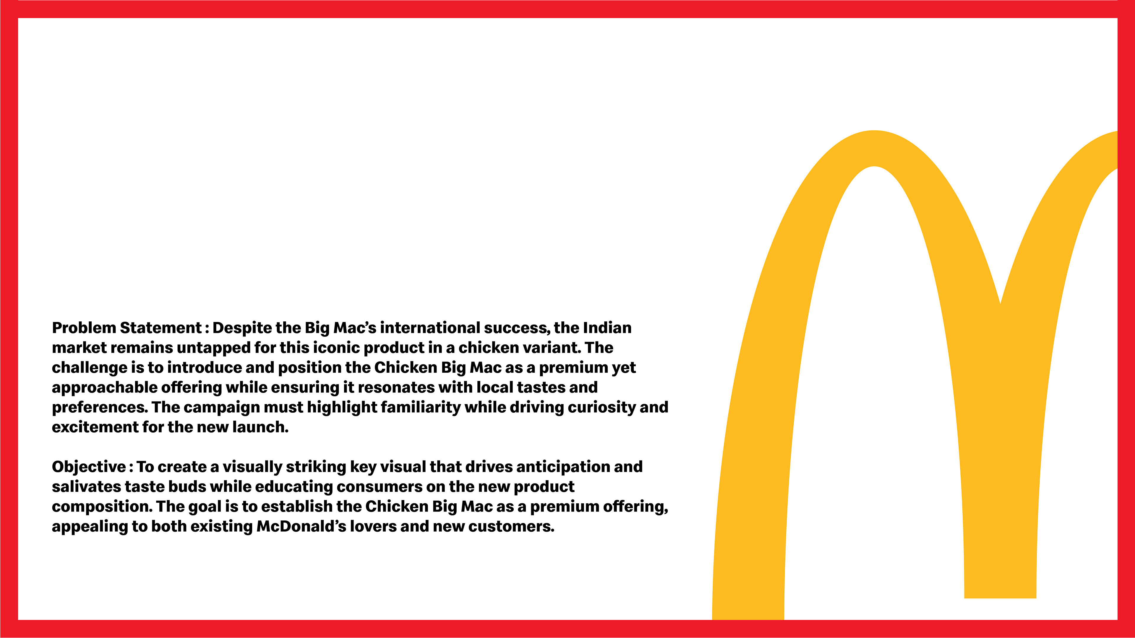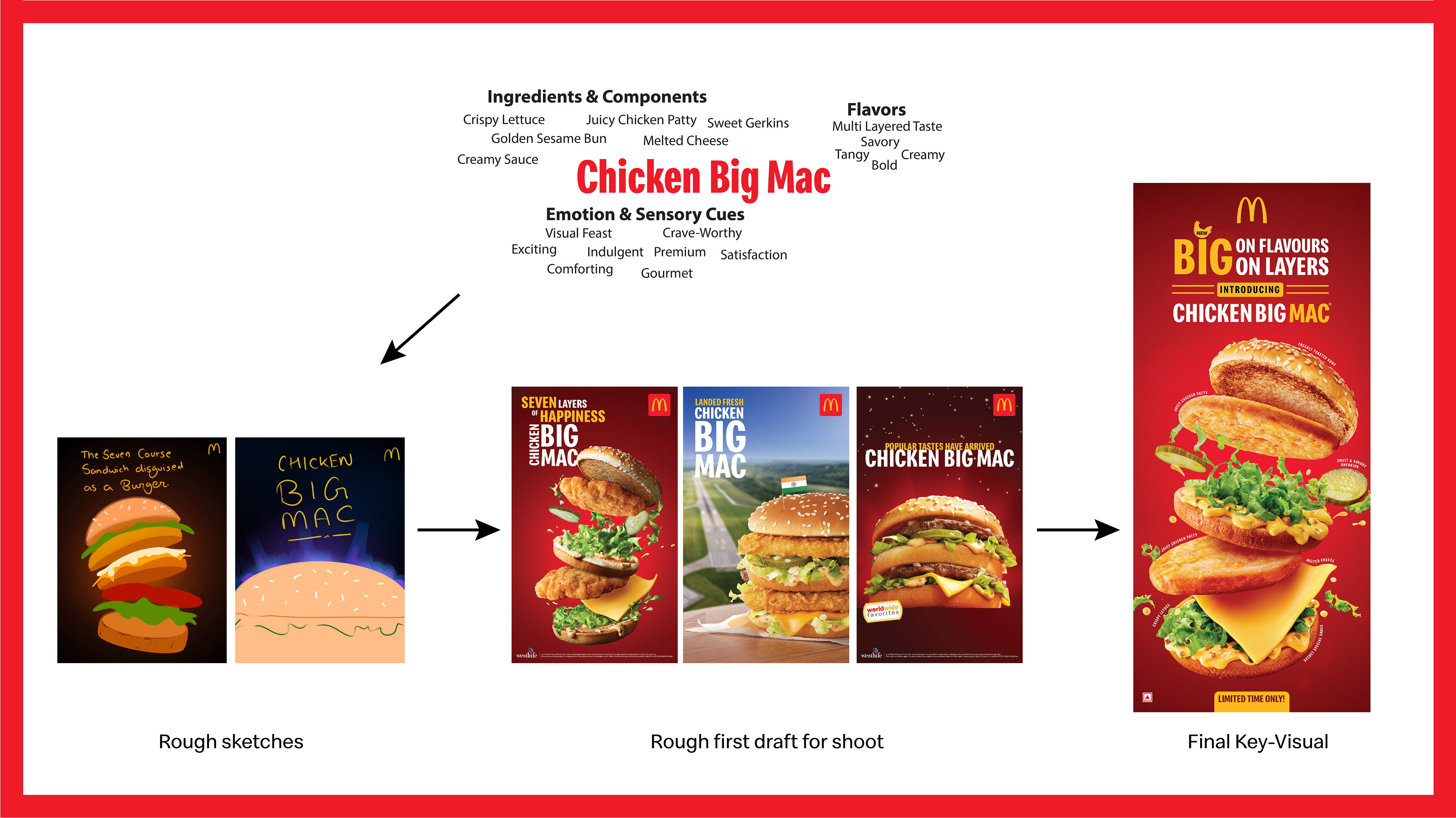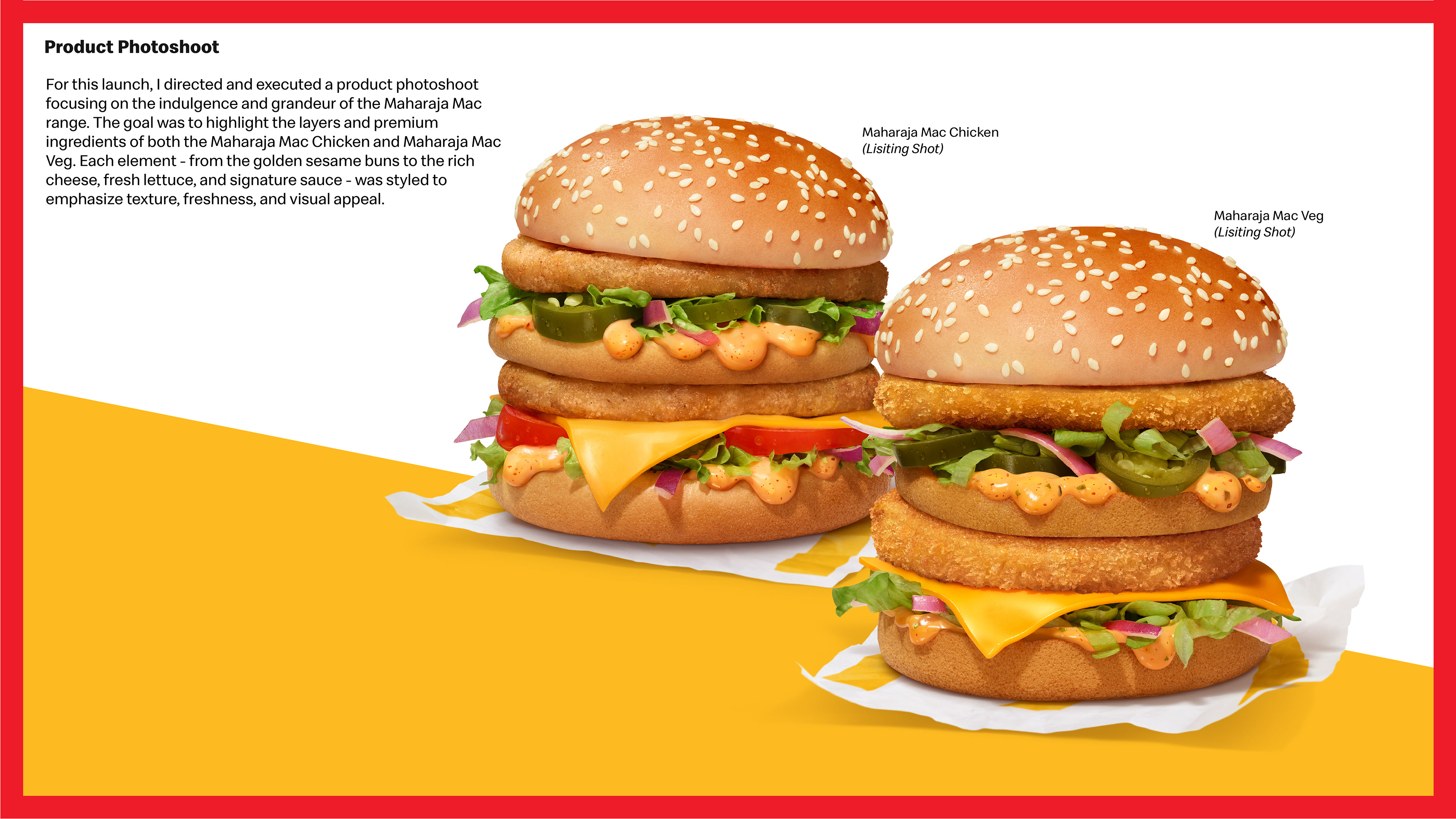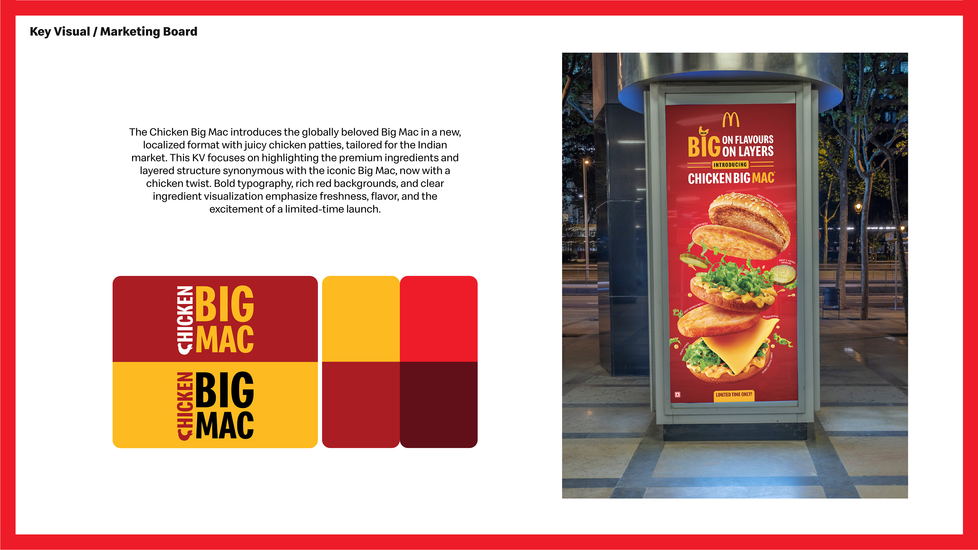 This project showcases the launch of the Chicken Big Mac, a globally inspired product brought to India for the first time. I was responsible for desidirection,meticulous, leading the photoshoot, and ensuring cohesive brand representation across all touchpoints. The campaign highlights the bold flavors and multi-layered textures of the Chicken Big Mac, featuring juicy chicken patties, freshly toasted sesame buns, crunchy lettuce, melted cheese, and a tangy sauce. Through strategic design and imagery, the project evokes a sense of indulgence, freshness, and excitement for a limited-time offering. This project involved art direction,meticulous attention to detail, ensuring the final visuals reflect the premium quality and iconic appeal of this new McDonald’s product. “All rights to the McDonald’s name, logo, and associated trademarks are owned by McDonald’s India. Used here for illustrative purposes only.”