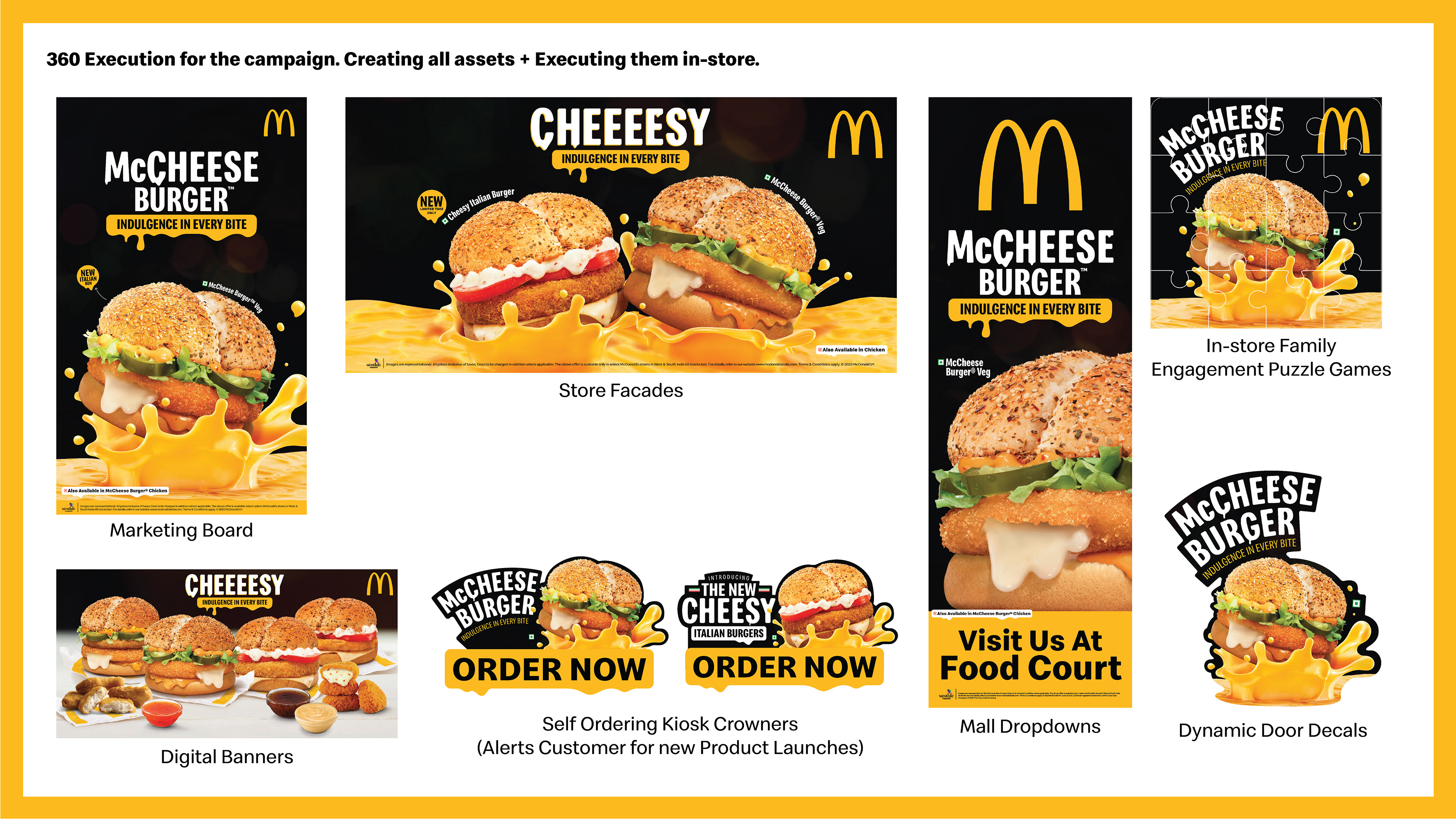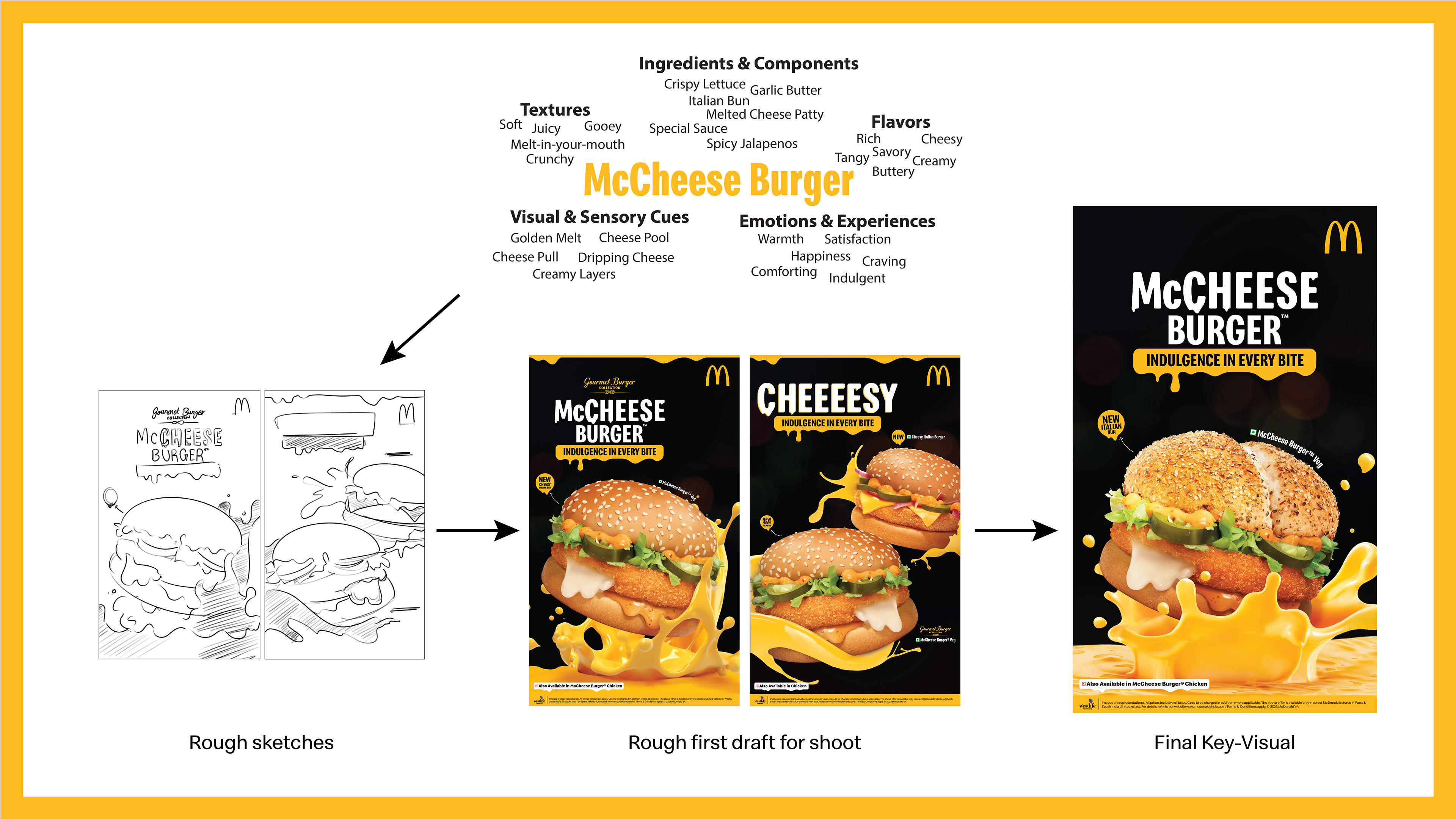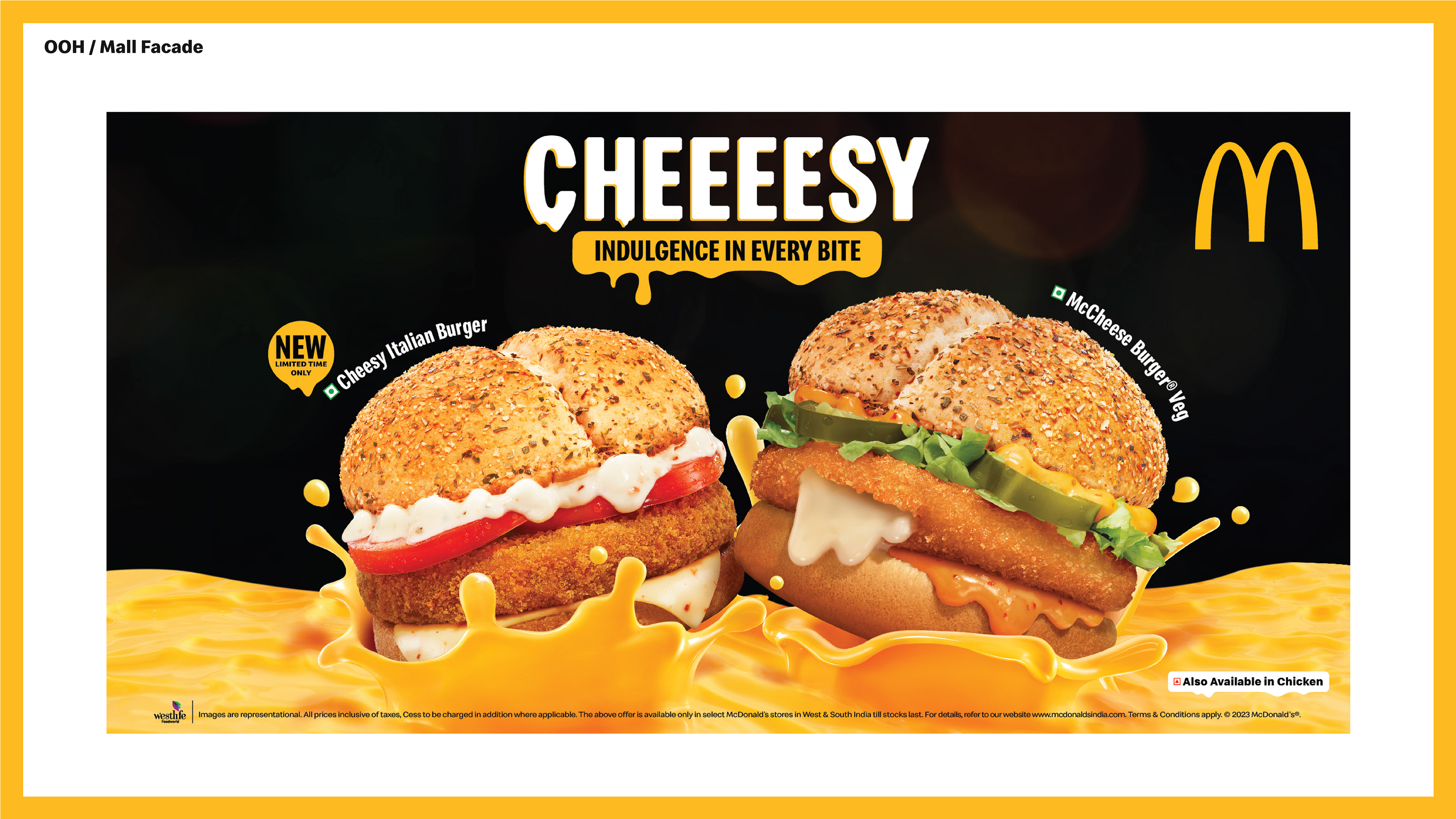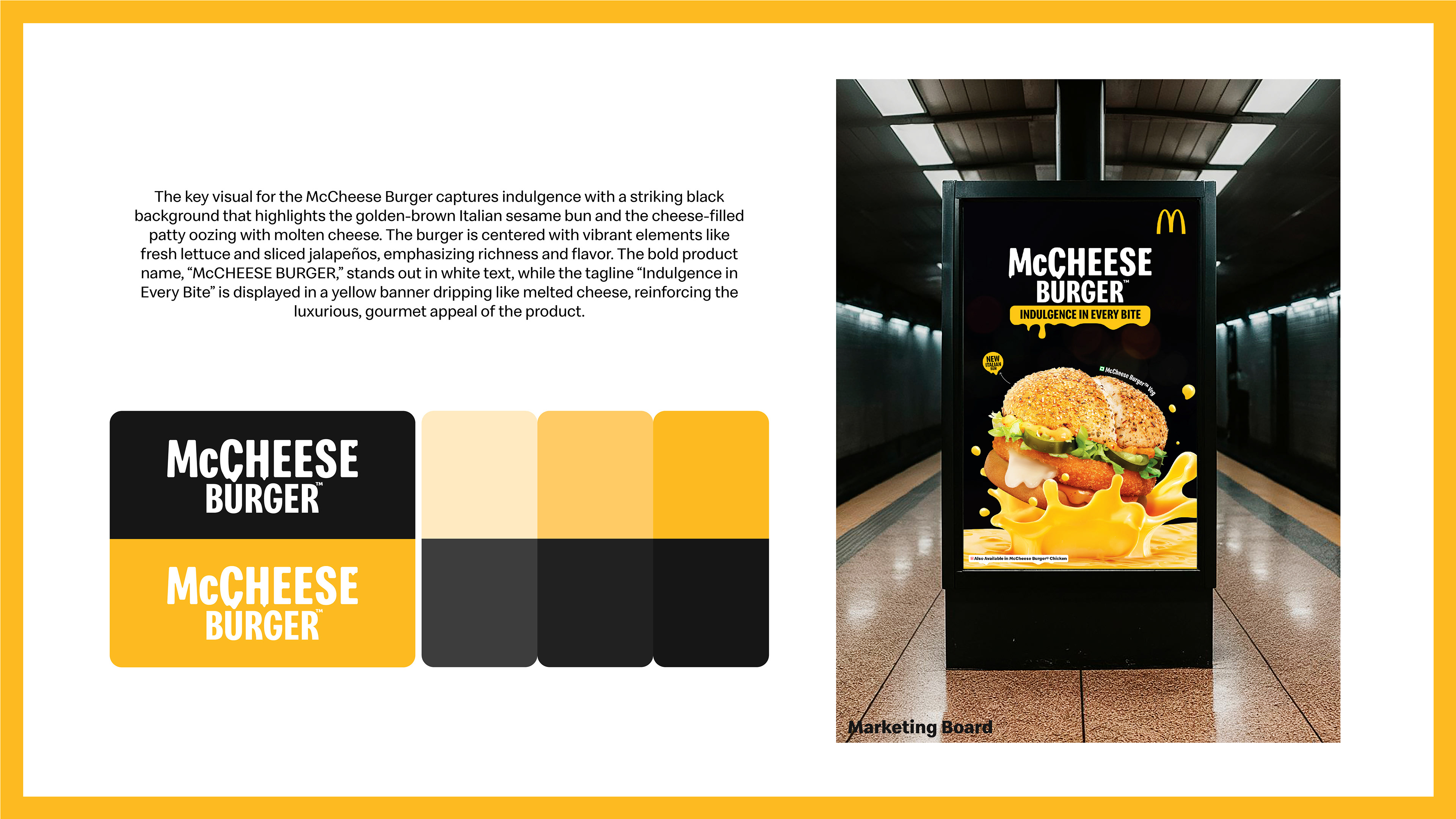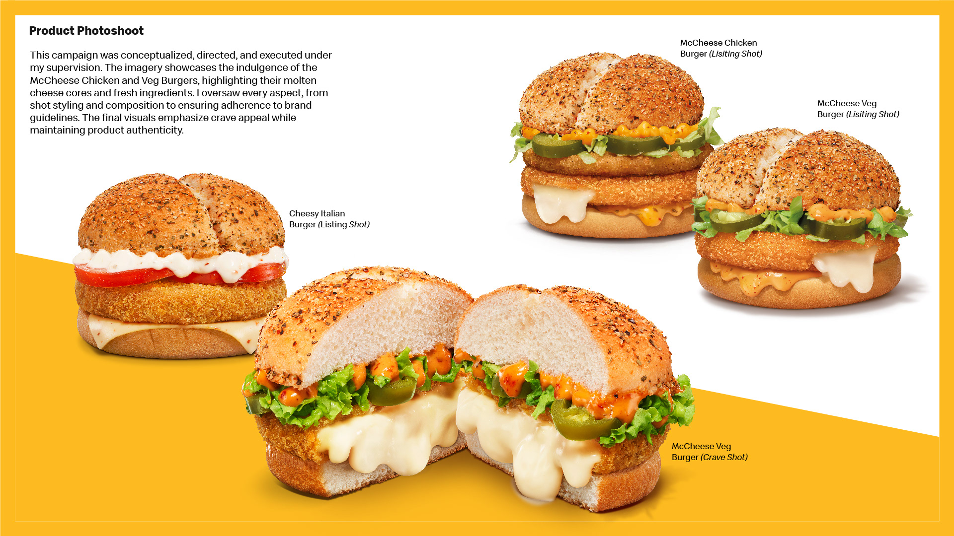 The McCheese Burger campaign highlights the indulgence of a fully melted cheese patty, designed to captivate cheese lovers. I created the Key Visual around the concept of “Indulgence in Every Bite,” using bold cheese drips and vibrant colors to emphasize the gooey texture and freshness of the ingredients. The introduction of the new Italian bun adds a premium touch, showcased prominently to enhance appeal. This KV was crafted to ensure strong brand recall across in-store, digital, and outdoor platforms, making the McCheese Burger a bold, crave-worthy addition to McDonald’s menu. “All rights to the McDonald’s name, logo, and associated trademarks are owned by McDonald’s India. Used here for illustrative purposes only.”